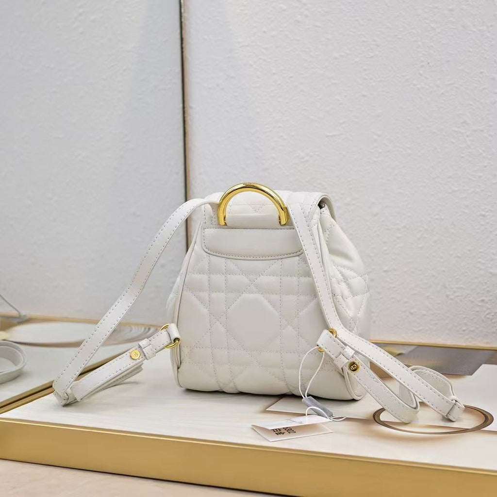Dimensions: 19.5 x 18.5 x 8.5 cm. This Di*r Caro backpack, a new addition to the Cruise 2025 ready-to-wear collection, embodies chic elegance. Meticulously crafted, it features oversized cannage topstitching for a refined look. The flap is adorned with a CD logo in antique gold-finish metal. It opens to a main drawstring compartment and a small flap pocket for everyday essentials. Gold-finish handles and an adjustable shoulder strap provide added comfort.