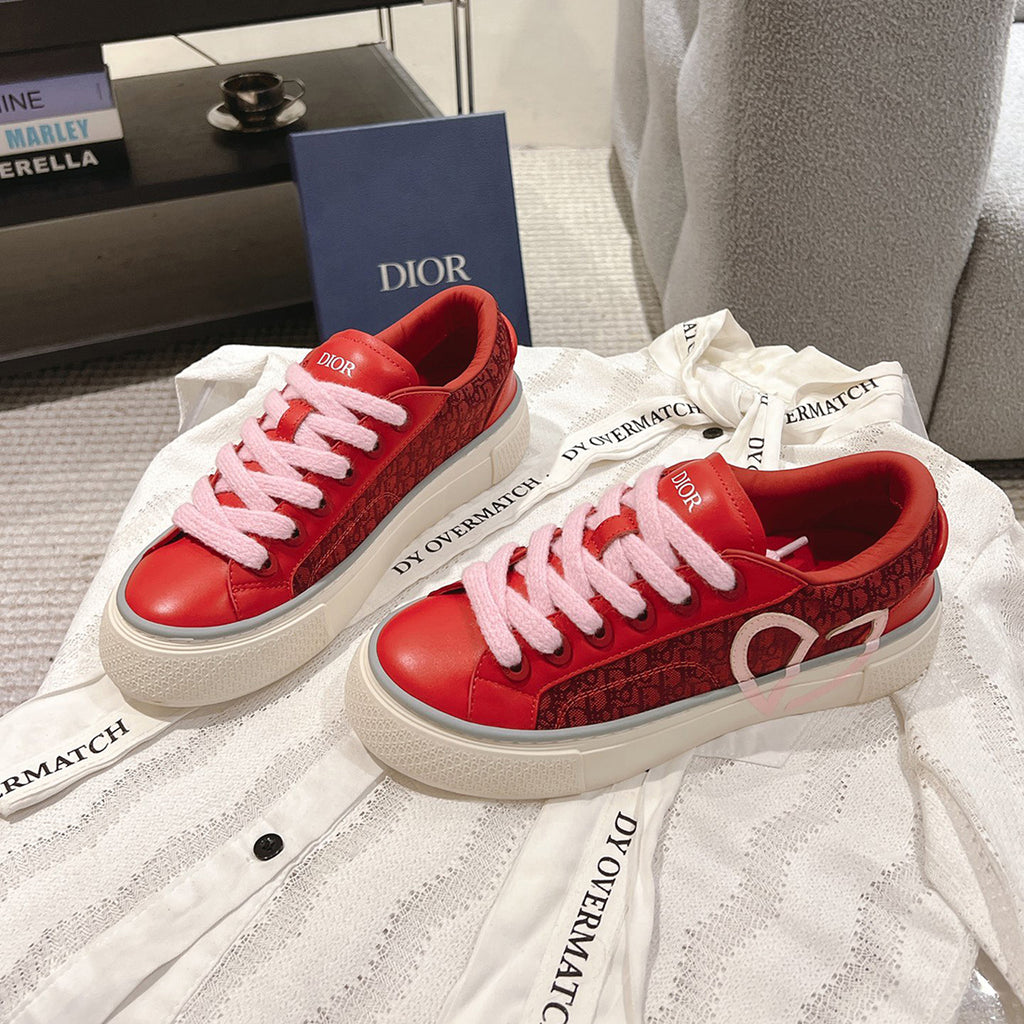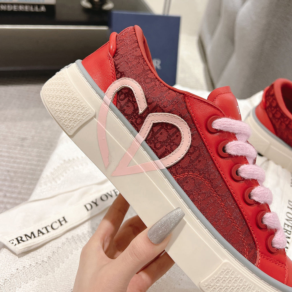 ◆ This specific colorway features red smooth calfskin paired with red Oblique jacquard canvas. Inspired by classic tennis shoe silhouettes, it showcases the iconic jacquard pattern on the side panels, with select versions also featuring a bold "CD Heart" emblem on the side.