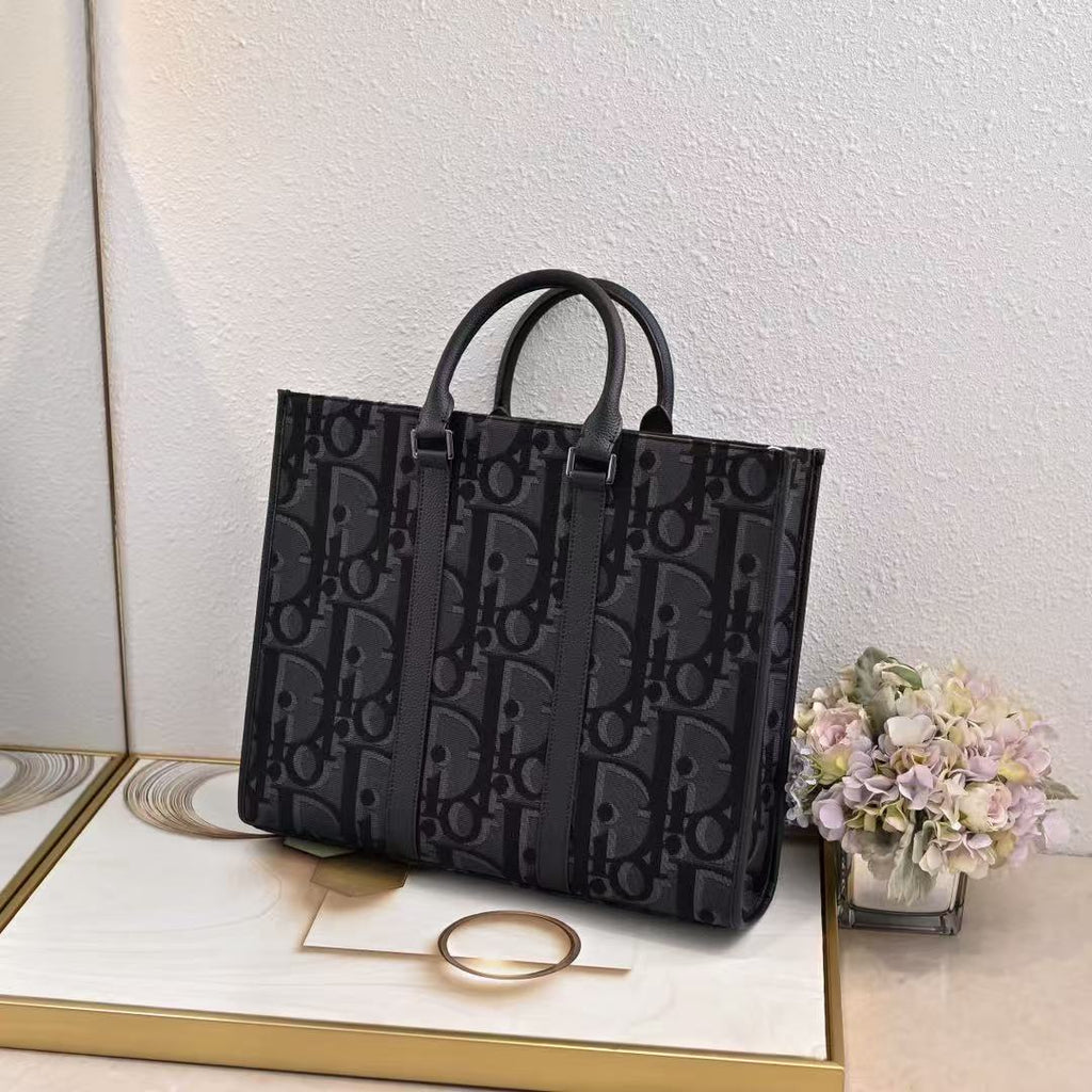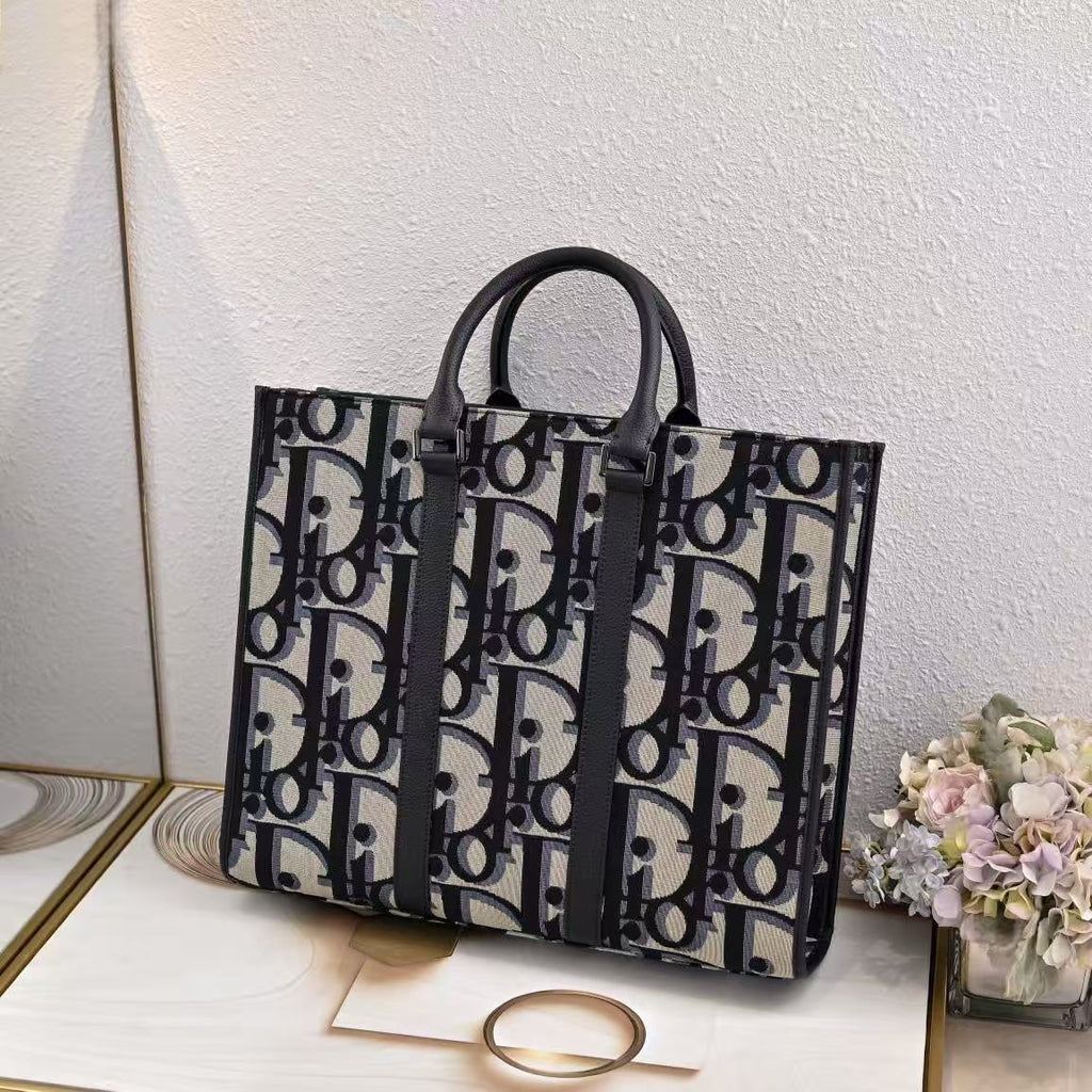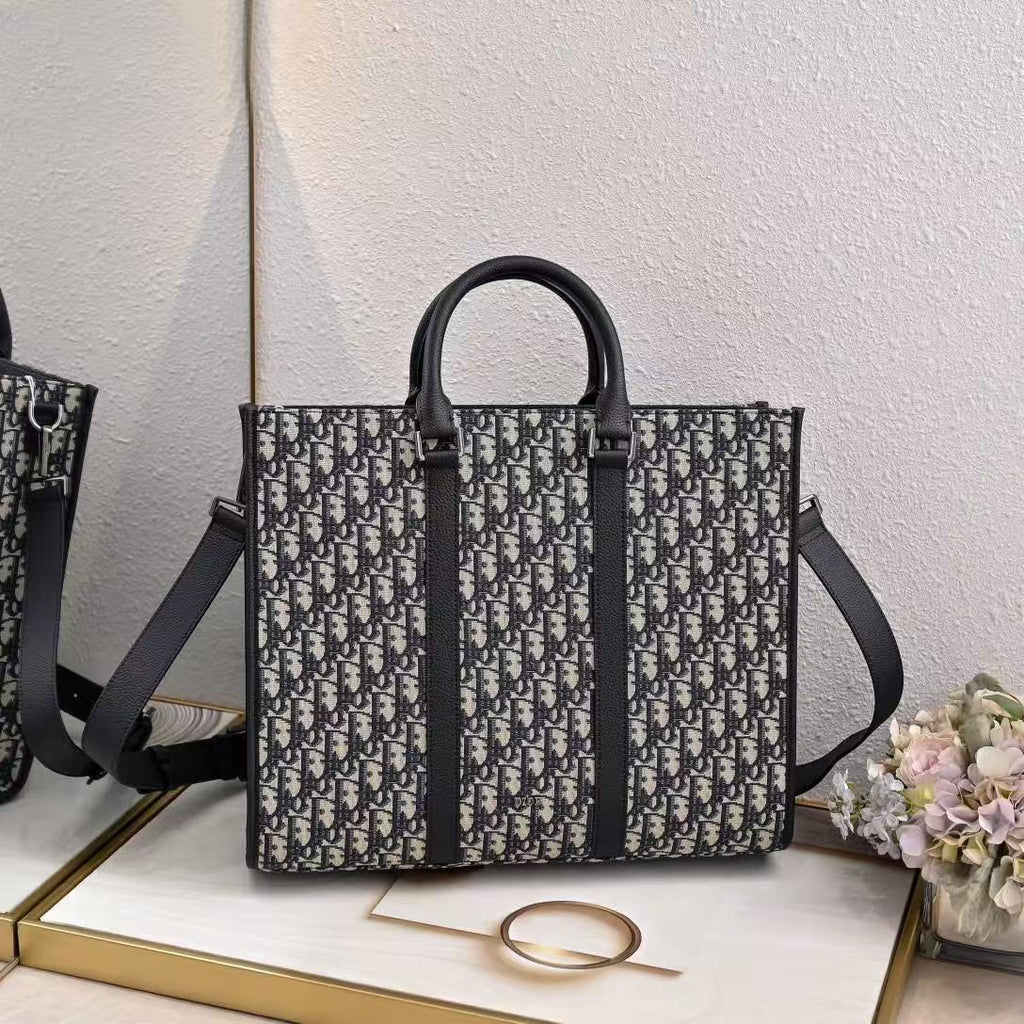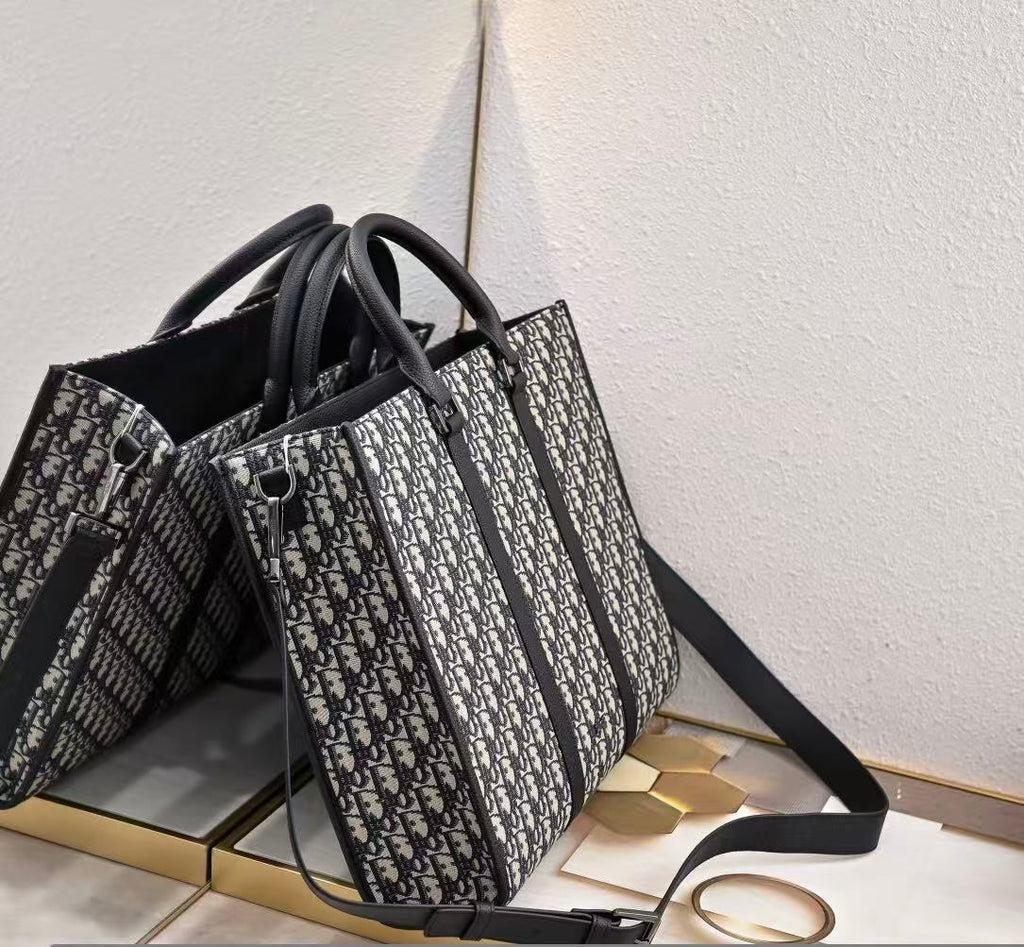 Size: 40.5x35x12 cm. The boxy tote bag features clean, sleek lines. The handles are made of durable and comfortable leather, and the removable, adjustable shoulder strap allows for versatile carry options, including hand-held, shoulder-carry, and crossbody. The main body of the bag is crafted from high-quality, durable canvas, which perfectly displays the monogram pattern details while maintaining a crisp, shape-preserving feel.