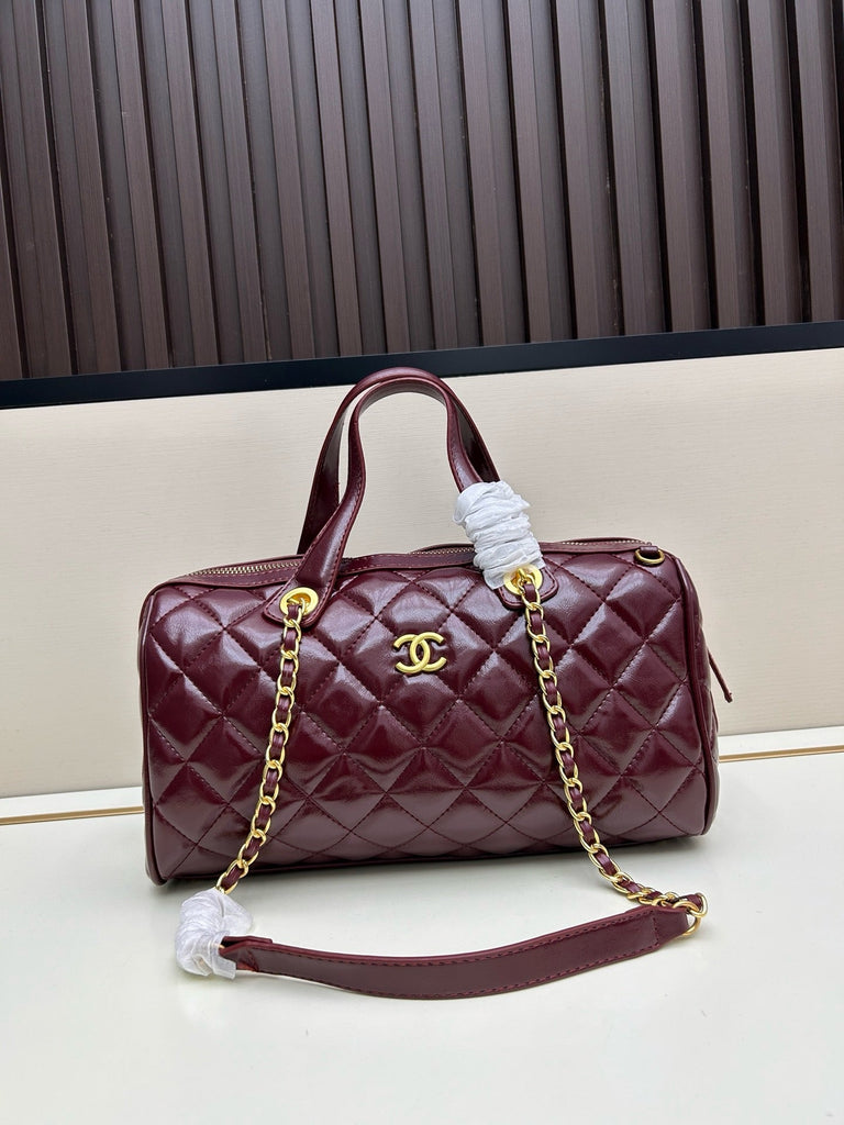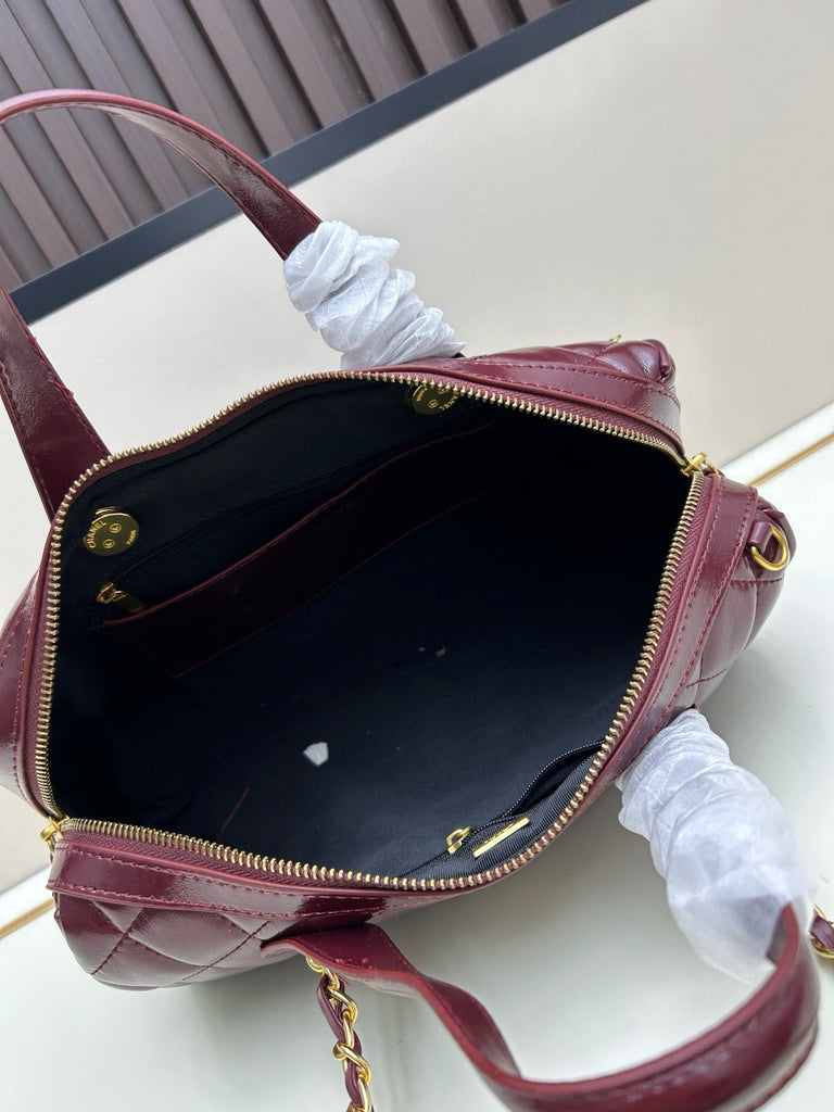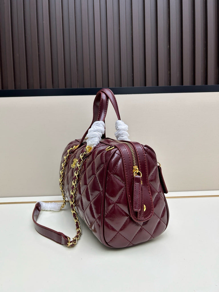 Measuring 30x20x8 cm, this bag is made of burgundy patent leather and features the brand's signature diamond quilting. It comes with a gold double C logo, a metal chain shoulder strap, and a carrying handle.