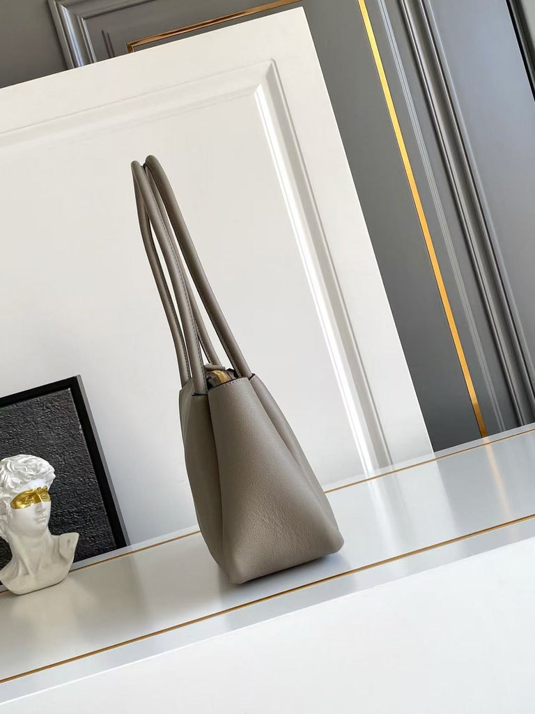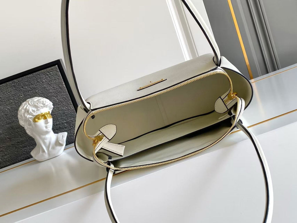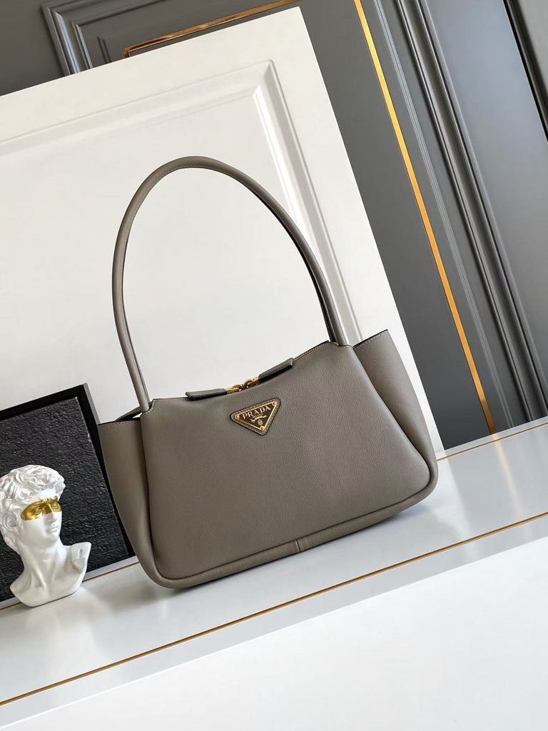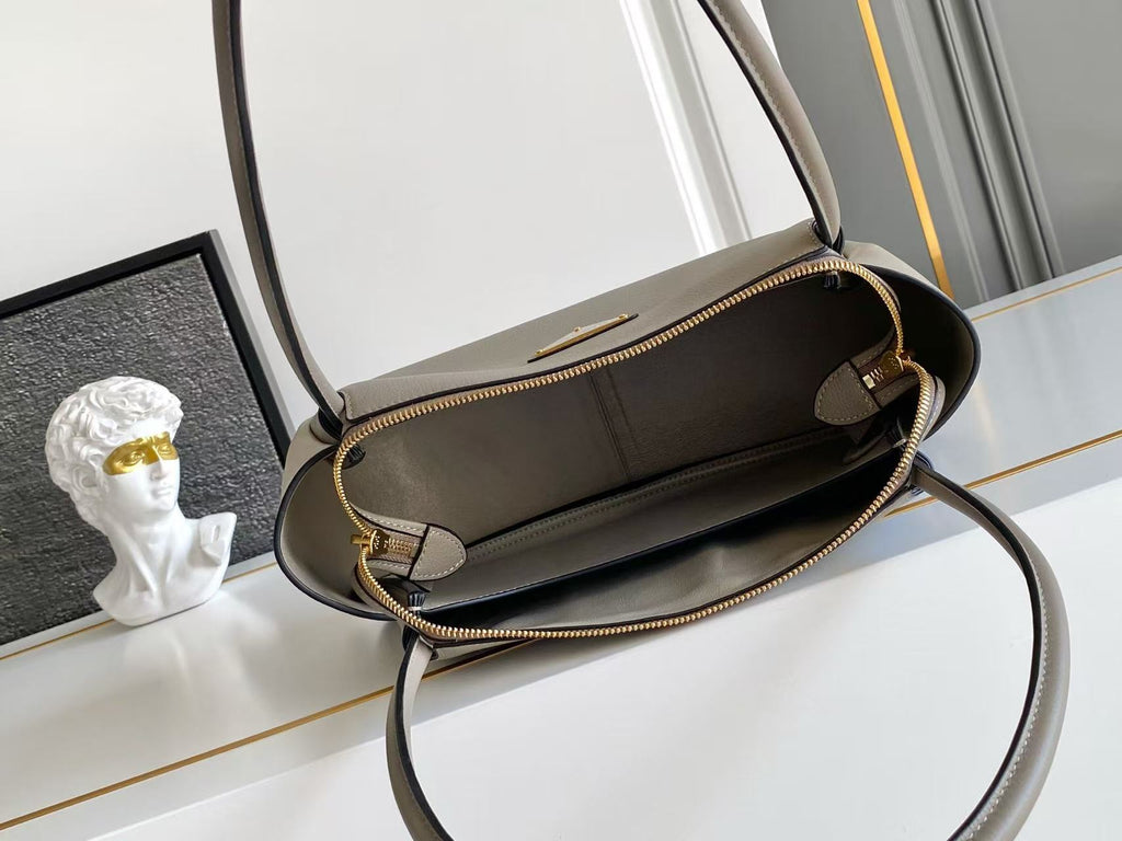 Dimensions: 28x18x11cm.This bag with a sophisticated, contemporary design features simple yet refined details, brightened by the metal hardware. The versatile style has sleek, minimalist lines emphasized by the buttery feel of soft grain leather. The accessory, an expression of exceptional artisanal know-how, is decorated with the iconic enameled metal triangle logo.