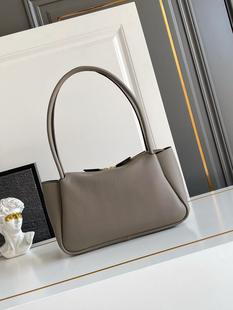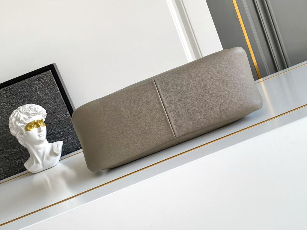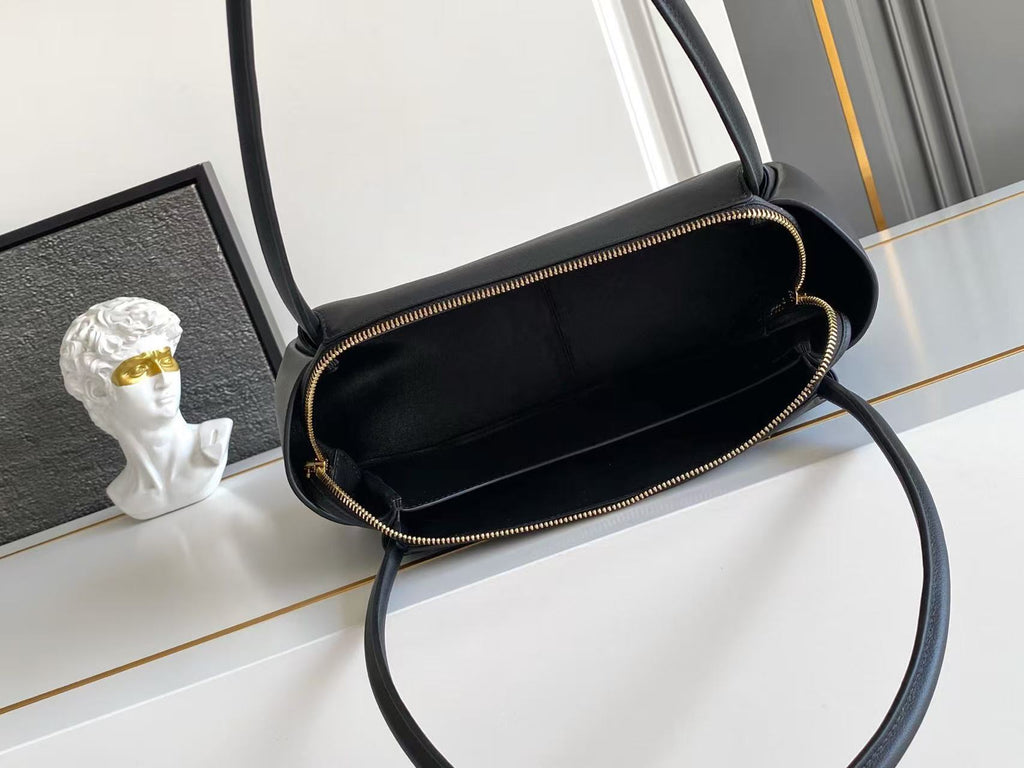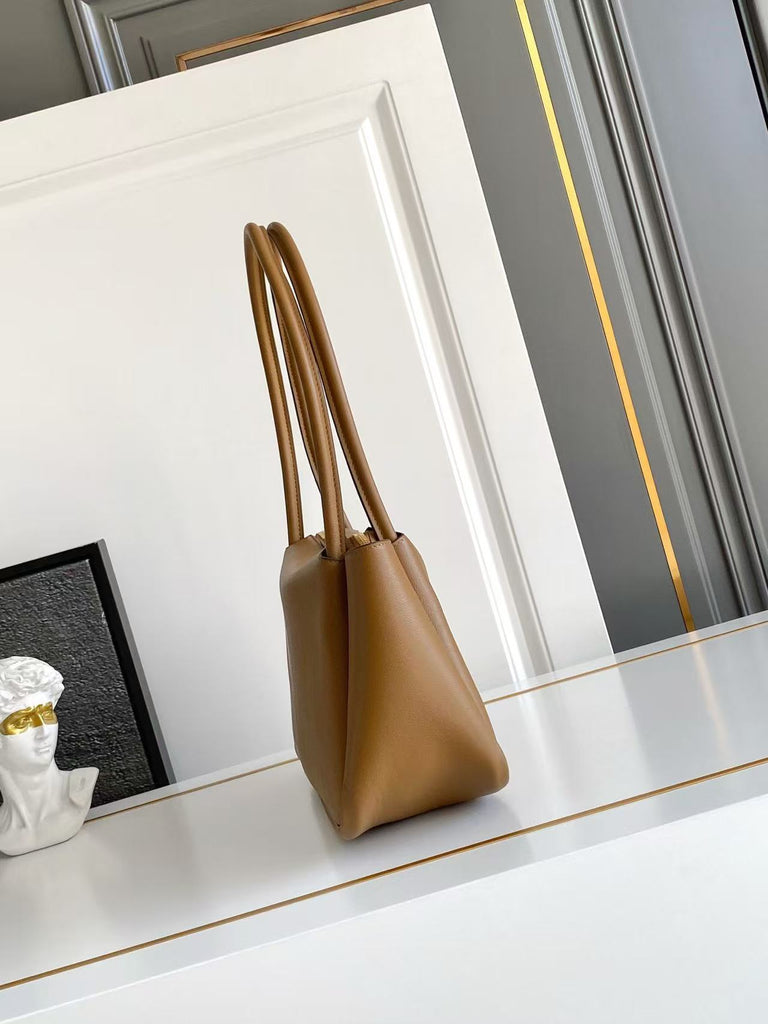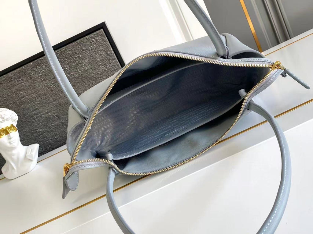 Dimensions: 28x18x11cm.This bag with a sophisticated, contemporary design features simple yet refined details, brightened by the metal hardware. The versatile style has sleek, minimalist lines emphasized by the buttery feel of soft grain leather. The accessory, an expression of exceptional artisanal know-how, is decorated with the iconic enameled metal triangle logo.