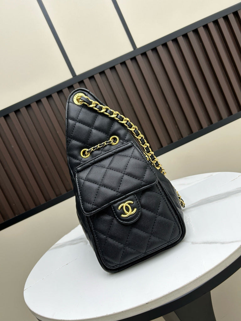 Measuring 30x26x14 cm, the drawstring design adds a touch of sophistication and practicality to the bag. It can be carried by hand or worn crossbody, blending vintage chain details with modern drawstring elements.