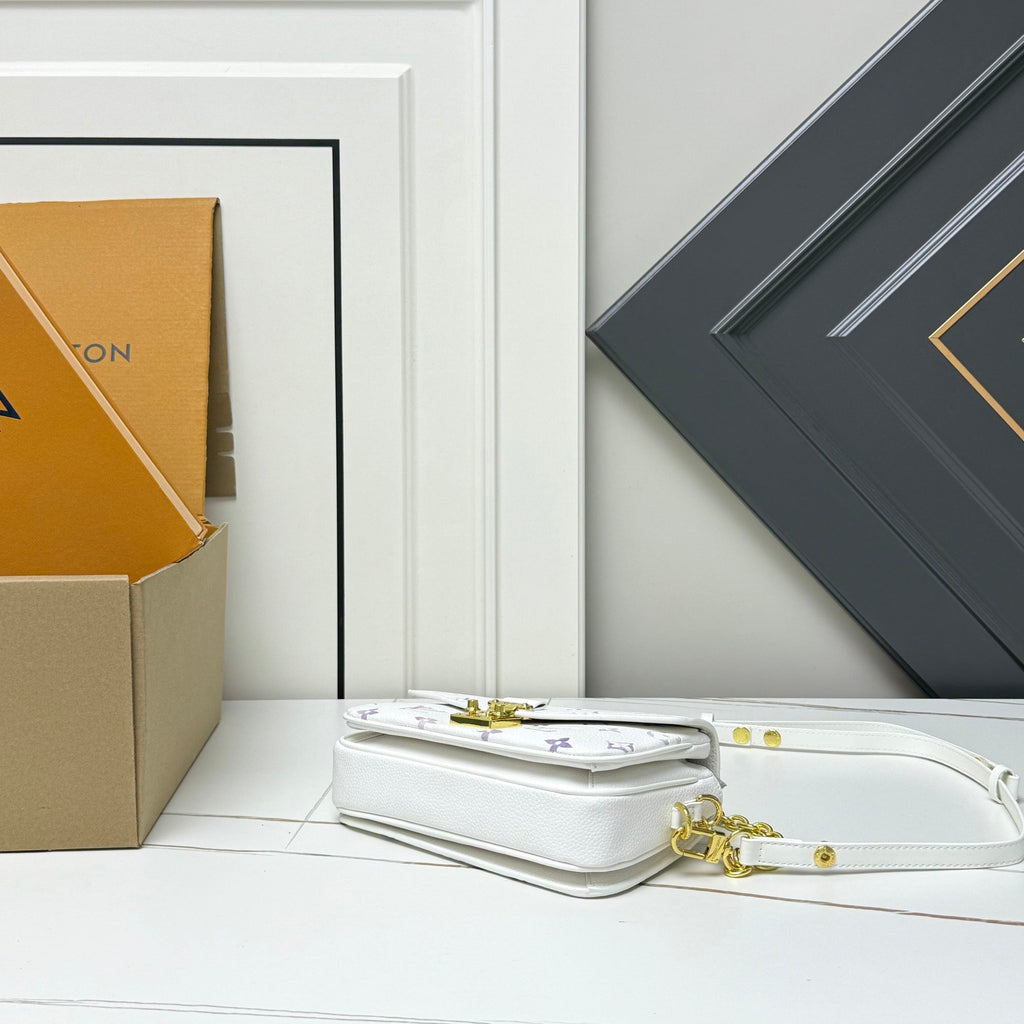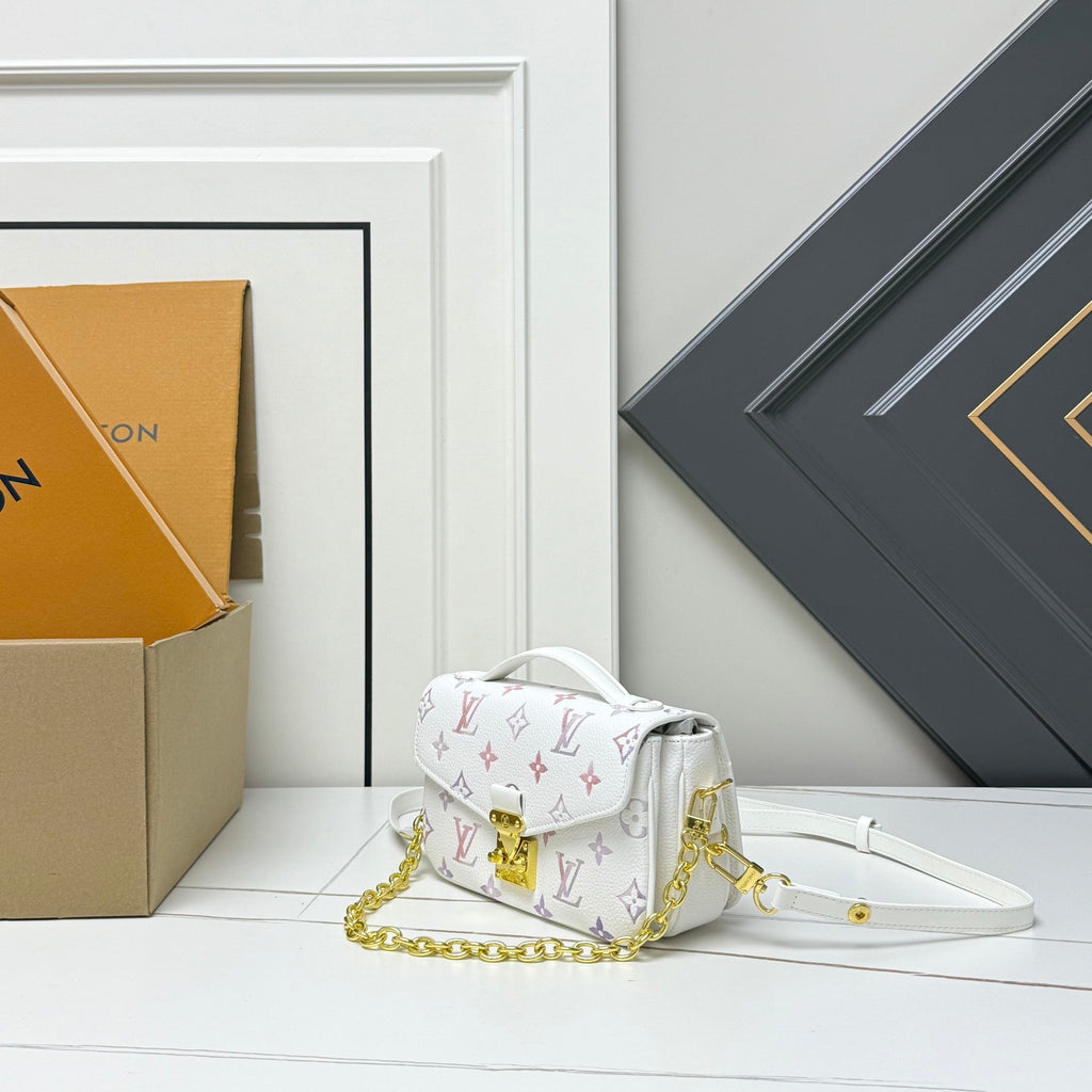 Measuring 21.5x6x13.5cm, this piece is made of white Monogram canvas with a colorful butterfly print, and features gold-plated metal hardware and a chain. Its delicate, petite, and playful style makes it highly recognizable and is part of the brand's limited-edition floral and insect collection.