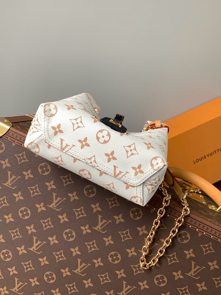 Measuring 17.0 x 17.0 x 7.0 cm, this piece is made of white Monogram canvas with brown leather trim and metal hardware. Its fresh and elegant style is highly recognizable and represents LV's innovative color interpretation of the classic Monogram pattern.